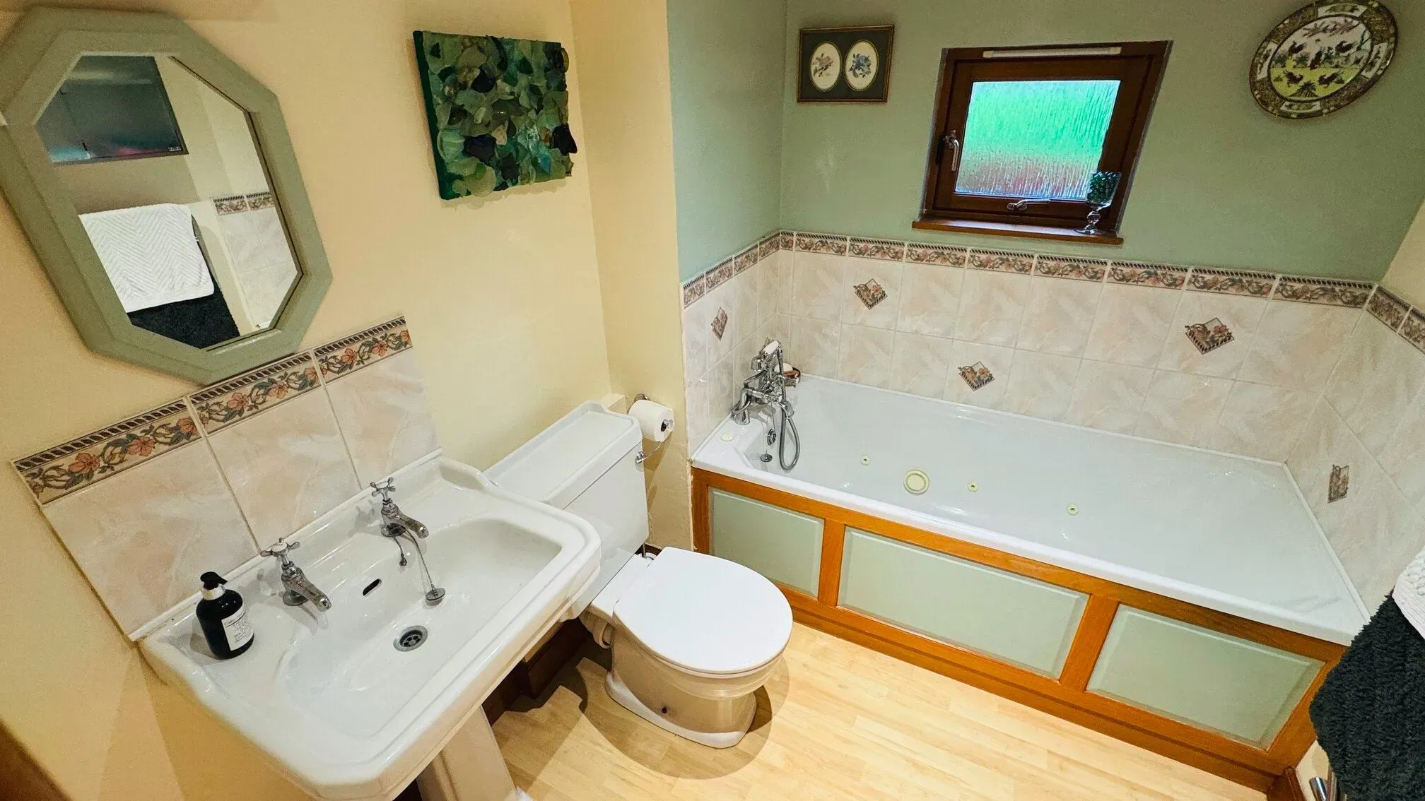 Large light-filled entrance hallway with laundry cupboard, downstairs cloakroom, pantry and seating area (formerly used as a B&B breakfast room). Off this hall is the downstairs double bedroom with en-suite shower room.