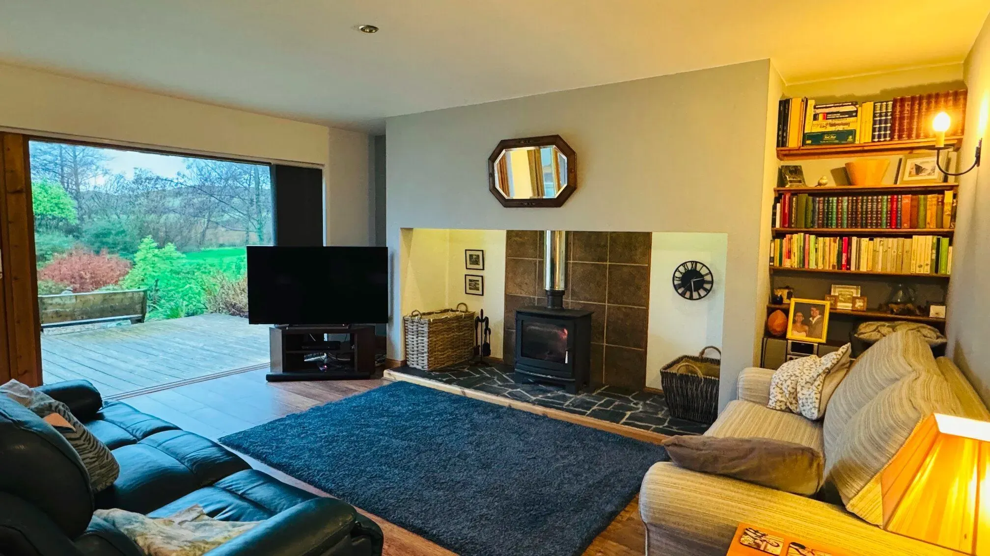 Also on this level is the beautiful and cosy living room with an external door to a large decked area. This room features a spectacular inglenook fireplace containing a wood-burning stove.